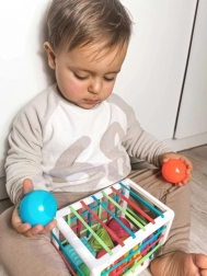 Cubul poate fi folosit și pentru învățarea culorilor și formelor la o vârstă mai mare. Benzile colorate elastice ale cubului sunt plăcute pentru copil și facilitează introducerea obiectelor. Acest produs indispensabil este ideal pentru copii de la vârsta de 12 luni, ajutând la dezvoltarea motoricii fine.