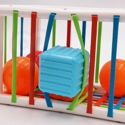 Benzi elastice pe cub permit introducerea și extragerea ușoară a obiectelor, încurajând experimentarea.