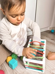 Copilul își dezvoltă simțurile și abilitățile manuale jucându-se cu cubul și diferitele forme.