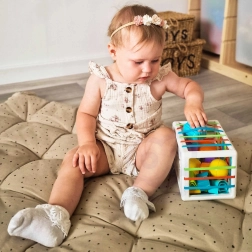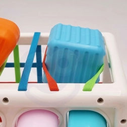 Introducerea și scoaterea pieselor prin benzile elastice, precum și prin sortatorul clasic, îi învață pe copii prinderea precisă, dezvoltă coordonarea mână–ochi și susține curiozitatea în explorarea noilor forme și texturi.
