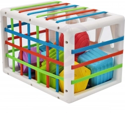 Benzile elastice de pe pereții cubului le permit copiilor să introducă și să scoată cu ușurință piesele, antrenează motricitatea fină și fac jocul fluent și motivant.