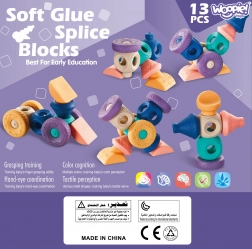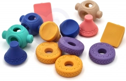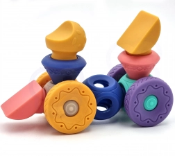 Piesele pot fi ușor conectate și asamblate în diverse construcții – de la turnuri simple până la vehicule amuzante, precum „mașinuța de curse”. Setul este ideal pentru joacă, învățare și mușcat în perioada erupției dinților. Ambalajul practic din cutie de carton cu fereastră îl transformă într-un cadou grozav pentru bebeluși de la 6 luni.