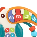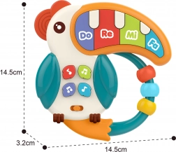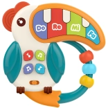 Pelicanul de la Woopie este jucăria muzicală ideală pentru cei mai mici. Datorită clapelor colorate cu tonurile „Do, Re, Mi, Fa”, copiii descoperă ușor lumea muzicii, în timp ce, prin glisarea mărgelelor și apăsarea butoanelor, antrenează motricitatea fină și coordonarea mână–ochi. Creasta moale și arcul cu inele funcționează totodată ca dentiție pentru alinarea dinților care erup.
