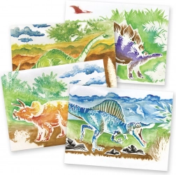 - Planșe magice pentru acvarelă cu motive de dinozauri care dezvăluie detalii la aplicarea apei și a culorii.