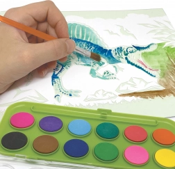 - 12 culori de acvarelă, 5 planșe magice pentru acvarelă, 2 pensule, instrucțiuni, cartonaș colecționabil cu dinozaur