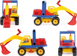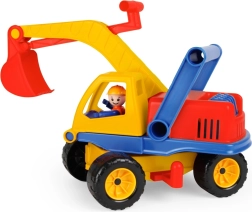 Excavator colorat pentru copii, lungime 35 cm, cu partea superioară rotativă, braț funcțional și figurină de șofer în cabină. Dispune de 2 axe, blocare a rotației și mâner practic în spatele cabinei pentru control ușor – ideal pentru nisipar și joacă în casă.