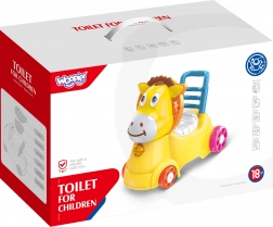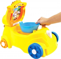 Șezutul se poate ridica, dezvăluind rezervorul detașabil, utilizabil ca oliță sau ca spațiu de depozitare pentru obiecte mici și jucării. Efectele luminoase și sonore adaugă distracție fiecărei plimbări și fac mai plăcută învățarea la oliță.