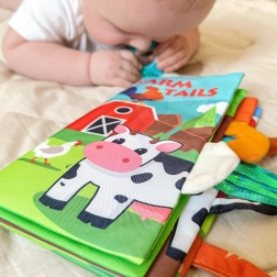 Datorită materialului textil rezistent, cărticica este impermeabilă și ușor de întreținut. Prinderea practică permite folosirea ei ca jucărie suspendată pentru cărucior sau pătuț, fiind mereu la îndemână acasă și în deplasare. Sigură de la naștere, excelentă ca primă jucărie educativă.