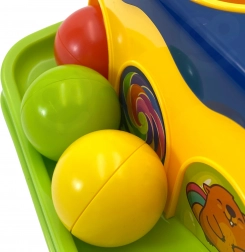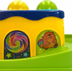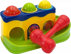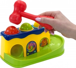 Cu ajutorul ciocănelului, copilul lovește bilele, care alunecă pe pistă. Copilul le poate urmări cum se rostogolesc, aducându-i multă distracție.