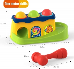Această jucărie combină jocul și învățarea printr-un mecanism colorat cu ciocănel, care ajută copiii să dezvolte abilități motorii.