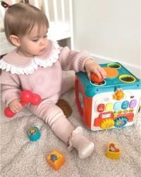 Fiecare activitate este concepută cu grijă pentru a sprijini diverse abilități precum coordonarea mână-ochi, recunoașterea formelor și culorilor, dezvoltarea auzului și exprimarea creativității. Datorită dimensiunilor sale reduse, cubul este ușor de transportat, dar oferă în continuare distracție nesfârșită pentru micii exploratori care doresc să învețe prin joacă.