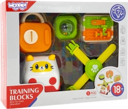 Setul include 4 cuburi interactive: un lacăt portocaliu cu cheiță pentru antrenarea prinderii și coordonării, ferestre cu zăvor și glisor pentru explorarea relației cauză–efect, un element rotativ cu bile pentru stimulare vizuală și benzi cu catarame și bucle care amintesc de o elice pentru exersarea închiderii. Toate sunt realizate din materiale robuste și sigure, potrivite pentru cei mici.