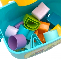 Datorită construcției compacte și mânerului, cutia este ușor de transportat; capacul funcționează ca sorter, iar interiorul ca spațiu de depozitare. După joacă, totul se pune simplu înăuntru – fără piese pierdute. Ideal pentru copii de la 18 luni, acasă și în călătorii.
