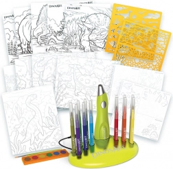 Setul DinosArt aerograf pentru colorat este ideal pentru orice mic artist care iubește dinozaurii și distracția creativă. Setul include un stilou electric de pulverizare, o stație de încărcare cu cablu USB și o gamă largă de markere speciale și vopsele acvarelă.