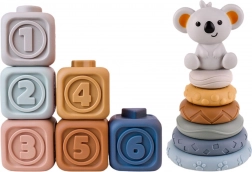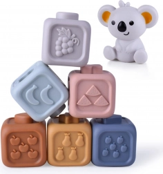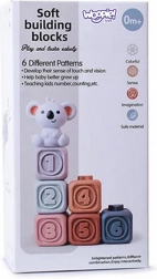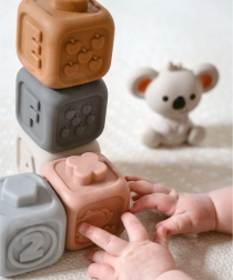 Moi, cuburile senzoriale din silicon WOOPIE în nuanțe pastelate delicate susțin dezvoltarea timpurie a copilului încă de la naștere. Șase cuburi cu cifre reliefate dezvoltă simțul tactil, văzul și logica, iar materialul sigur servește și ca jucărie de dentiție în perioada erupției dinților. Cuburile pot fi stivuite, strânse în mână (scot sunet), conectate datorită reliefului și folosite și la joaca în apă. Drăgălașa koală adaugă setului un farmec jucăuș.