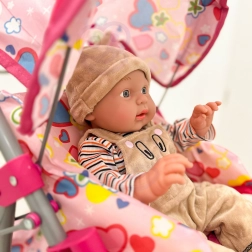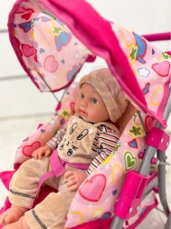 Copertina protejează păpușa de soare, iar coșul inferior găzduiește toate comorile copilului.