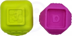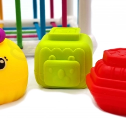 Șase cubulețe ferme cu suprafețe și culori diferite stimulează curiozitatea, dezvoltă simțul tactil și vizual și îi învață pe copii culorile și formele.