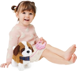 Adorabilul cățeluș de pluș de 22 cm, care după conectarea cablului cu telecomandă poate merge, lătra, da din coadă și mișca capul. Controlul este simplu: prin apăsarea lesei pornești mersul, prin atingerea capului activezi efectele, iar la bătăi din palme cățelușul pornește din nou la plimbare. O jucărie interactivă grozavă pentru copii, care distrează și stimulează simțurile.
