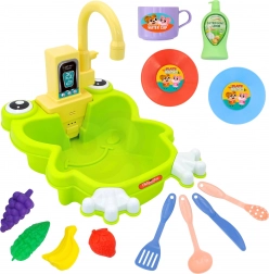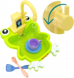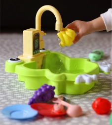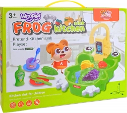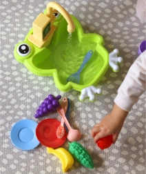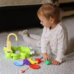 Chiuveta Broscuță este o jucărie interactivă grozavă care transformă activitățile zilnice din bucătărie într-un joc distractiv. Robinetul realist cu circulație a apei, după turnarea apei în chiuvetă și introducerea bateriilor, imită spălarea reală a vaselor și fructelor. Datorită designului simpatic de broscuță, copiii sunt imediat atrași și motivați să exploreze.