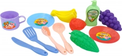 Farfurii, cană, tacâmuri, fructe și legume, plus sticluță pentru „detergent” – tot ce are nevoie un mic ajutor în bucătărie.