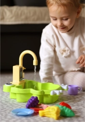 După umplerea chiuvetei și pornirea robinetului, apa începe să circule – copiii pot „spăla” fructe și vase ca adulții.