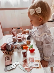 - Set complet de 25 piese – coș, fructe și legume, biscuiți, apă, cola, înghețată, card de plată, bancnote și monede, telefon etc.