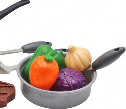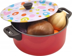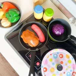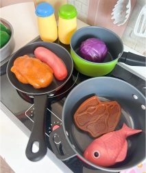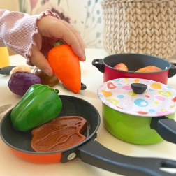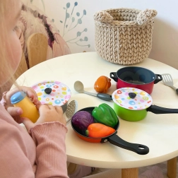 Oale cu capace, tigăiță și ingrediente colorate le permit copiilor să imite gătitul adevărat și să-și dezvolte imaginația și motricitatea fină.