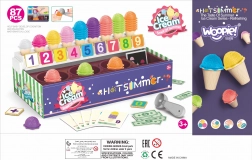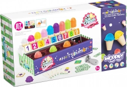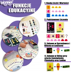 Setul de joc gelaterie de la marca Woopie oferă nu doar distracție la joaca de-a vânzătorul de înghețată, ci oferă și învățarea numerelor, culorilor și a adunării de bază. Conține 87 de piese inclusiv bile de înghețată, cornete, carduri de comandă, bani, jetoane cu numere și linguriță de înghețată.