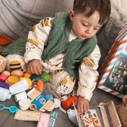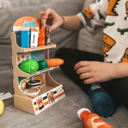 Jocul de-a magazinul susține gândirea independentă, comunicarea și joaca creativă. Datorită celor 42 de elemente – de la fructe și legume la băuturi și conserve – copiii își pot crea propriile scenarii și exersa situații cotidiene.