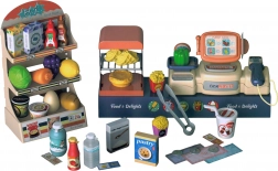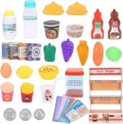 Setul include fructe, legume, băuturi, conserve, bancnote și monede – totul pentru ore lungi de joc creativ de magazin.