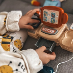 Copiii pot „bipa” produsele și pot auzi sunete autentice de scanare. Sertarul pentru bani și butoanele susțin jocul realist și învățarea despre plată.