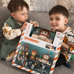 Cu acest set realist de supermarket, copiii pot încerca rolul de vânzător și de client. Casa de marcat cu scanner, sertar funcțional pentru bani și bancnote și monede din hârtie îi învață elementele de bază ale educației financiare și interacțiunii sociale. Este inclus și un cântar, precum și o ofertă bogată de alimente.
