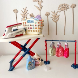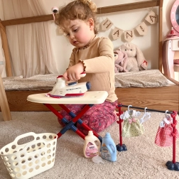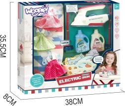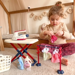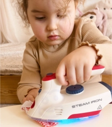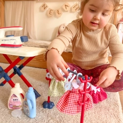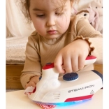 Fierul de călcat este o jucărie sigură pentru copii, deoarece nu se încălzește, dar este echipat cu multe funcții care animă jocul: buton pentru a imita sunetele reale de călcat, lumină LED și efecte sonore sub formă de melodii. Acest set este ideal pentru copiii cărora le place să imite părinții în activitățile zilnice.