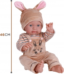 Această păpușă bebeluș realistă în hăinuță de iepuraș este creată pentru joacă plină de afecțiune. Hăinuța cu glugă și urechiușe, body-ul cu motiv drăgălaș și botoșeii moi creează un aspect delicat pe care copiii îl adoră. Datorită membrelor mobile puteți așeza sau ridica păpușa cu ușurință, extinzând posibilitățile de joacă.