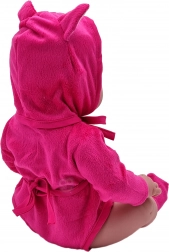 Păpușa poartă un costum roz adorabil cu design de urs și glugă, oferind un aspect jucăuș și atractiv.