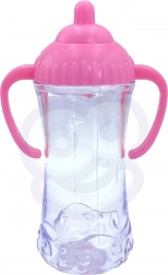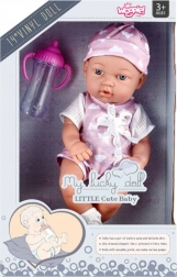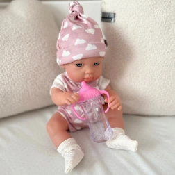 Păpușa are mâini și picioare moi, din cauciuc, și un corp din plastic fără umplutură textilă, ceea ce asigură durabilitate și întreținere ușoară. În pachet vei găsi și o sticluță roz, pe care păpușa o poate ține în mânuțe – perfectă pentru joaca de-a hrănitul.
