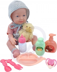 Setul include tot ce au nevoie micii îngrijitori: păpușă îmbrăcată, suzetă, ursuleț, biberon și set de masă (farfurie, furculiță, linguriță), completate de două sticluțe pentru „cosmetice” pentru scenarii de baie și îngrijire. Păpușa are membre moi, din cauciuc, mobile și un trup din plastic fără umplutură din pluș.