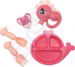 Setul include farfurie compartimentată, tacâmuri, suzetă cu șnur și alte accesorii care transformă jocul într-o adevărată îngrijire.
