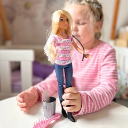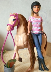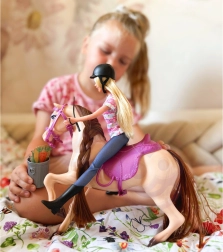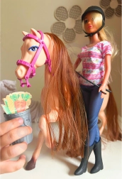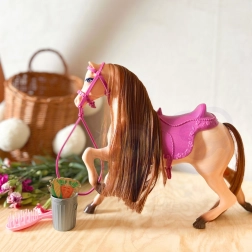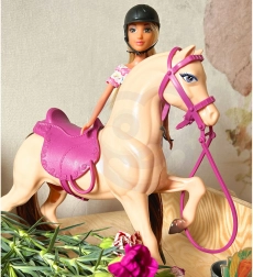 Păpușa și calul au păr lung și des, oferind oportunități nelimitate pentru coafare și stilizare.