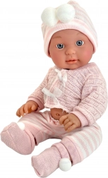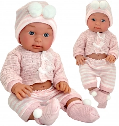 Cardiganul roz tricotat, chiloțeii în dungi și căciulița cu ciucuri sunt plăcute la atingere și se îmbracă și dezbracă ușor.