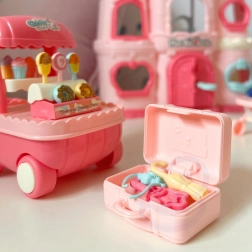 - Cărucior roz, căruț cu înghețată și bunătăți, valiză, corn/ pernuță pentru somn, umbrelă, aparat foto, 2 ceasuri, cheițe