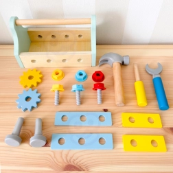 Setul de unelte din lemn pentru copii oferă o joacă distractivă și educativă, în care cei mici exersează primele activități de bricolaj. Uneltele realiste (ciocănel, șurubelniță și cheie), șuruburile, piulițele, roțile dințate și plăcuțele de construcție se pot înșuruba și fixa în orificiile din cutie – ceea ce sprijină gândirea logică și înțelegerea mecanismelor simple.