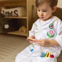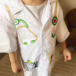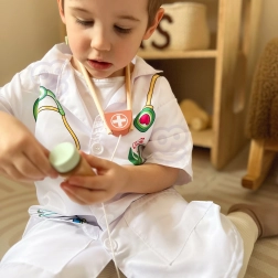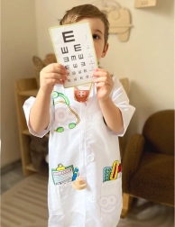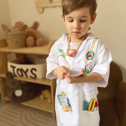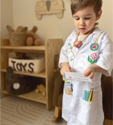 Acest costum medical prelucrat cu precizie de la Woopie oferă micilor iubitori de medicină echipamentul perfect pentru jocurile lor imaginative. Include imprimări colorate ale instrumentelor precum stetoscop, medicamente şi termometru. Datorită buzunarelor libere, este ideal pentru depozitarea altor obiecte de joc.