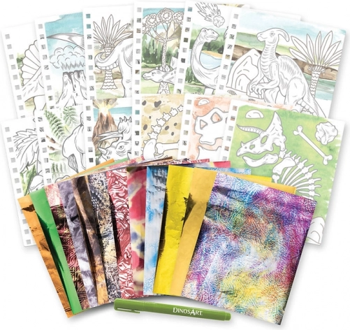 Setul de cărți de colorat cu folii DinosArt îmbină creația distractivă cu descoperirea lumii dinozaurilor. Datorită pixului adeziv pentru folii, foliile strălucitoare se transferă ușor pe zonele marcate, rezultând imagini lucioase impresionante fără murdărie. Copiii își dezvoltă motricitatea fină, răbdarea și creativitatea.