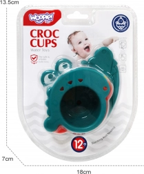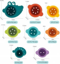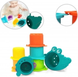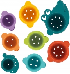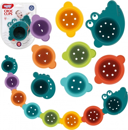 Cănuțele pot fi introduse una în alta, stivuite într-un turn înalt sau conectate lateral într-o „coadă” lungă. Una dintre cănuțe are un aspect drăgălaș de crocodil, care adaugă și mai multă distracție băii. Culorile și formele orificiilor ajută la învățarea culorilor și a formelor geometrice.