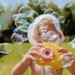 Ventilatorul integrat suflă bulele mai departe și amplifică efectul. Ideală pentru joaca în aer liber, la soare.