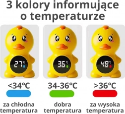 Scală color intuitivă: albastru = mai puțin de 34 °C, verde = 34–36 °C, roșu = mai mult de 36 °C. Forma ergonomică a rățuștii este prietenoasă pentru copii și sigură pentru utilizare în apă. Ajutor ideal pentru băi zilnice și joacă în apă vara.