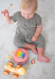 - jucărie de tras, xilofon cu bețe (ochi detașabili), elemente senzoriale/angrenaje, mașinuță cu lansare