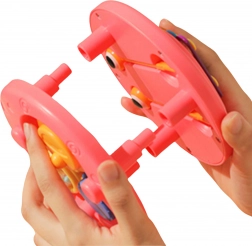 „Ochii” detașabili funcționează ca bețișoare. Copiii pot ciocăni pe clapele colorate, antrenând ritmul, auzul și coordonarea mână–ochi.