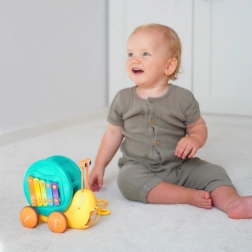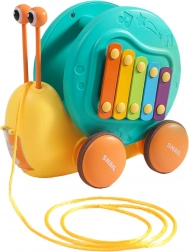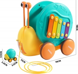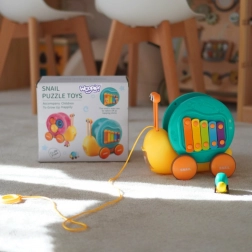 Acest melc multifuncțional de la WOOPIE îi cucerește pe copii din prima clipă. Cochilia colorată servește drept xilofon cu clape pe care se poate ciocăni cu „ochii” detașabili – bețișoare. Datorită șnurului rezistent, copiii pot trage și împinge melcul, dezvoltând coordonarea mână–ochi și echilibrul. Pe spate se află un buton care deschide pista de lansare pentru mica mașinuță-melc, oferind numeroase momente de bucurie.
